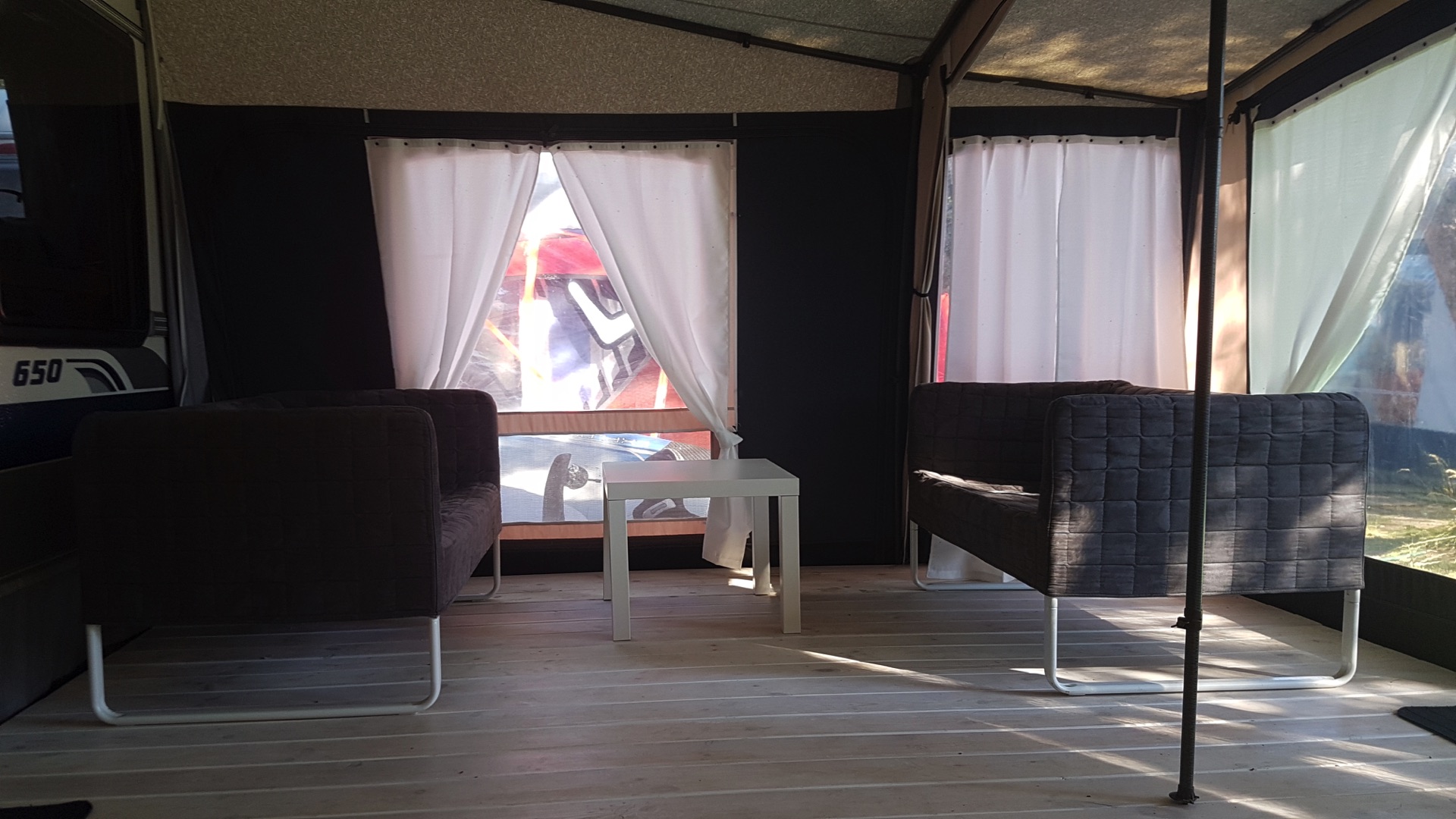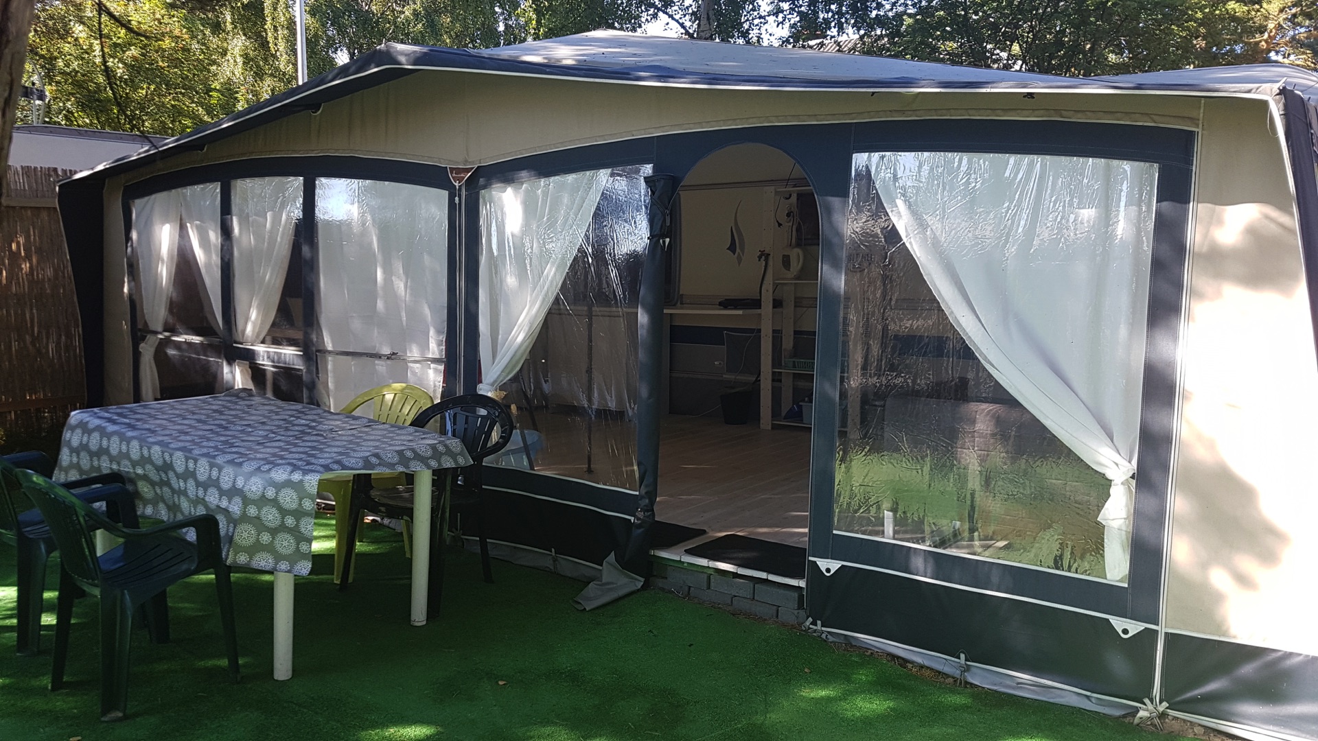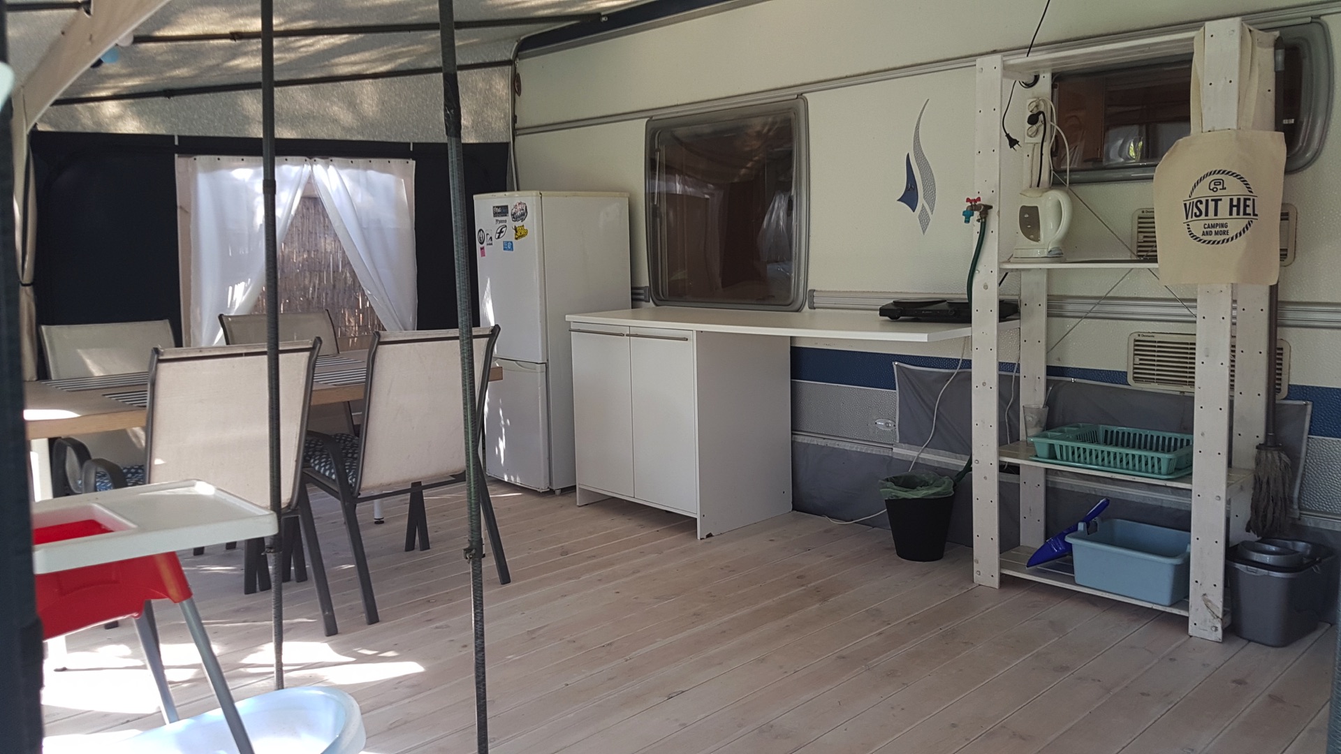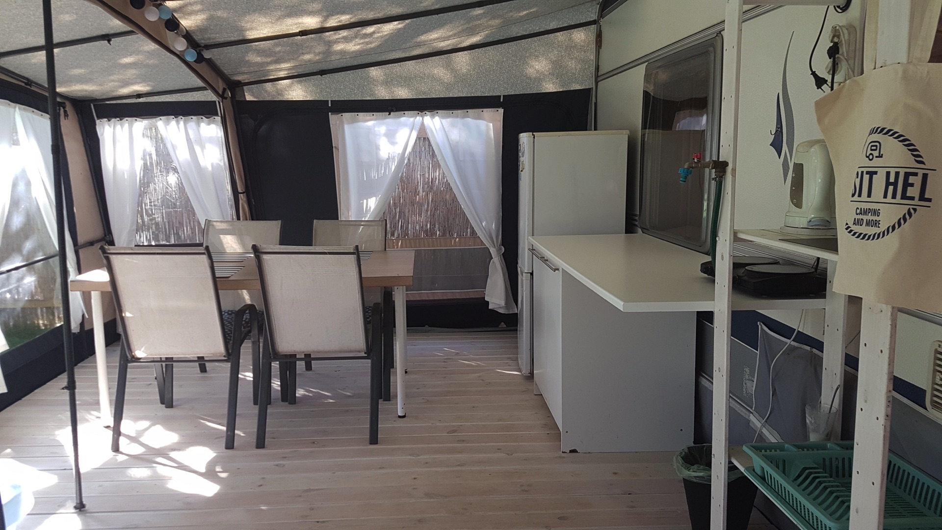 Przyczepa stoi po prawej stronie od wjazdu, w okolicy małych sanitariatów w zadrzewionej, spokojnej części.  Przed przyczepą jest miejsce do siedzenia.