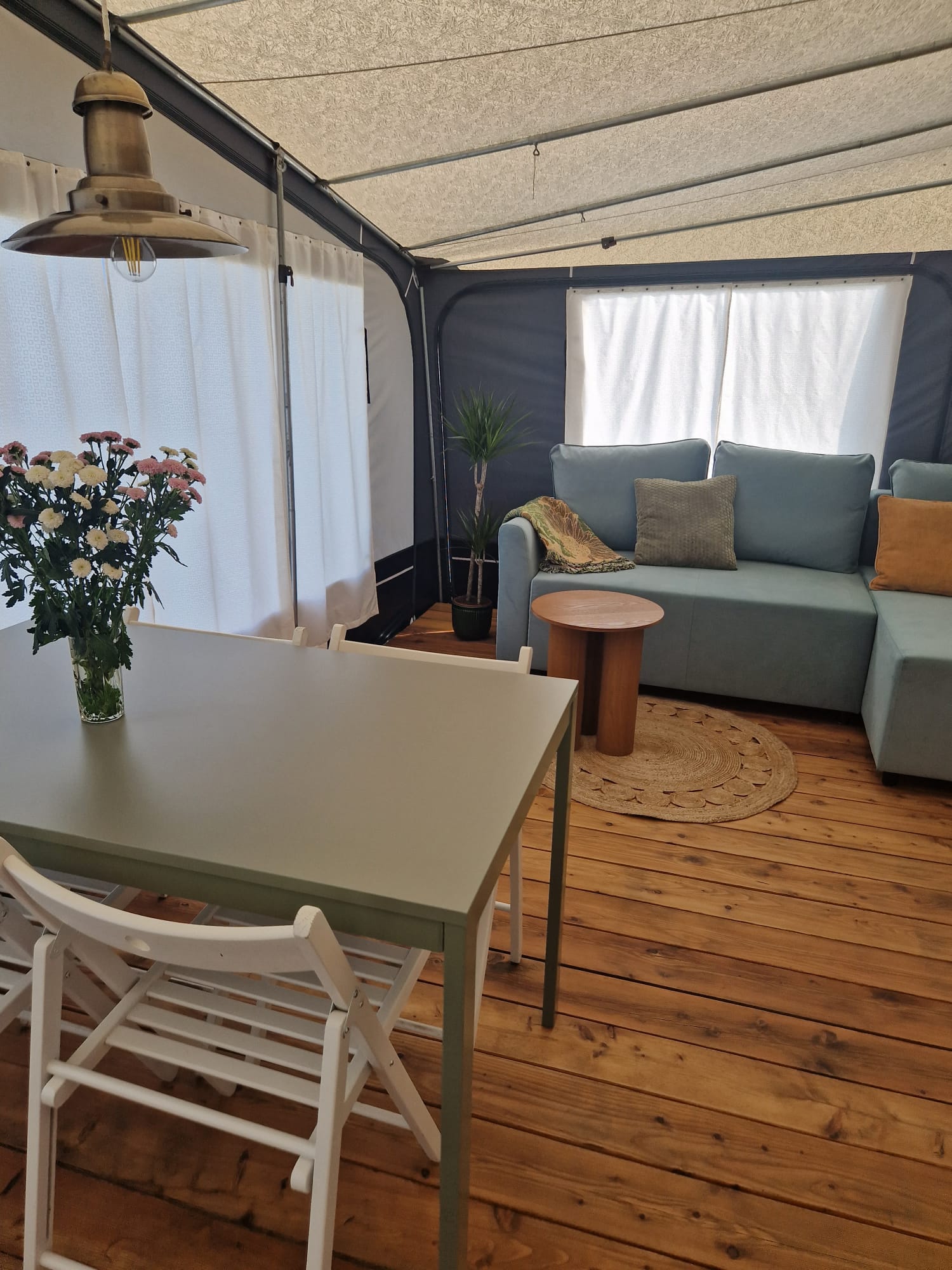 Przed przyczepą jest przestrzeń na wystawienie stoliczka i krzeseł.